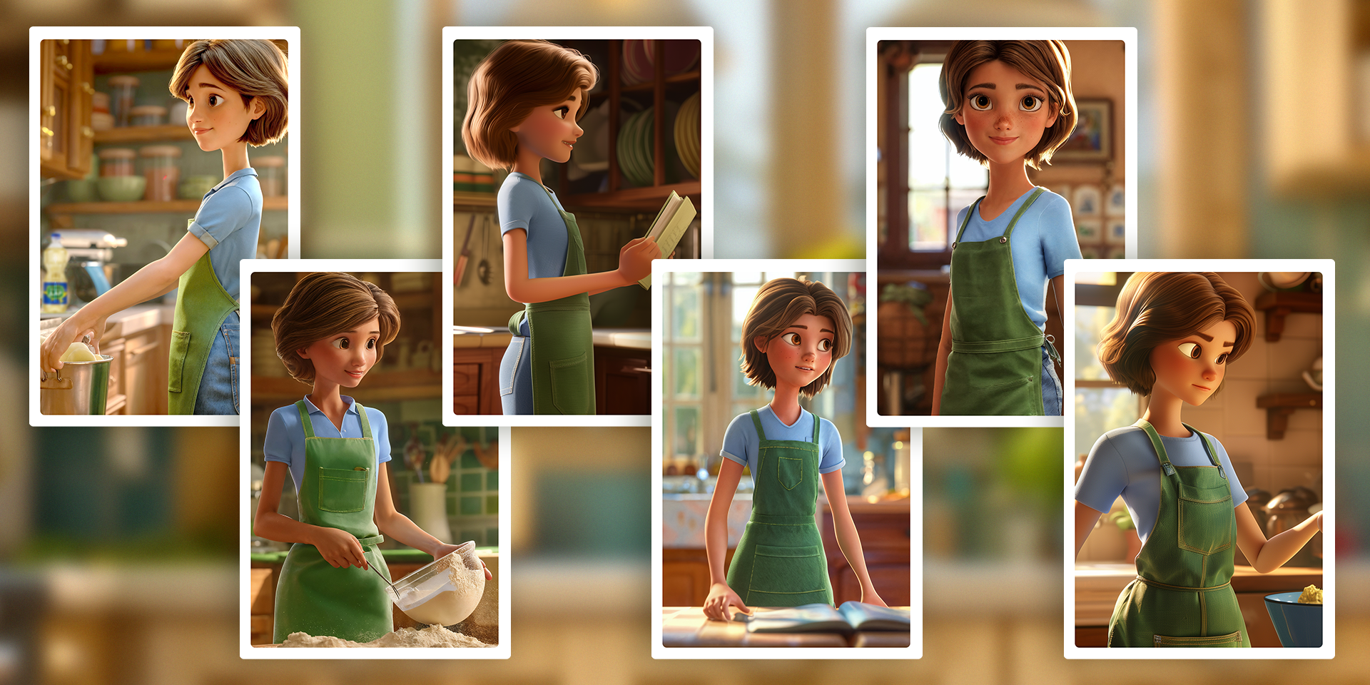 Кожна сцена відтворювала атмосферу домашнього затишку: кухню, деталі декору, теплі кольори, динаміку рухів. Завдяки функціоналу Midjourney ми перенесли персонажку зі студійного білого фону до побудованих інтер’єрів, синхронізуючи пози, емоції та ключові моменти зі звуковою доріжкою.