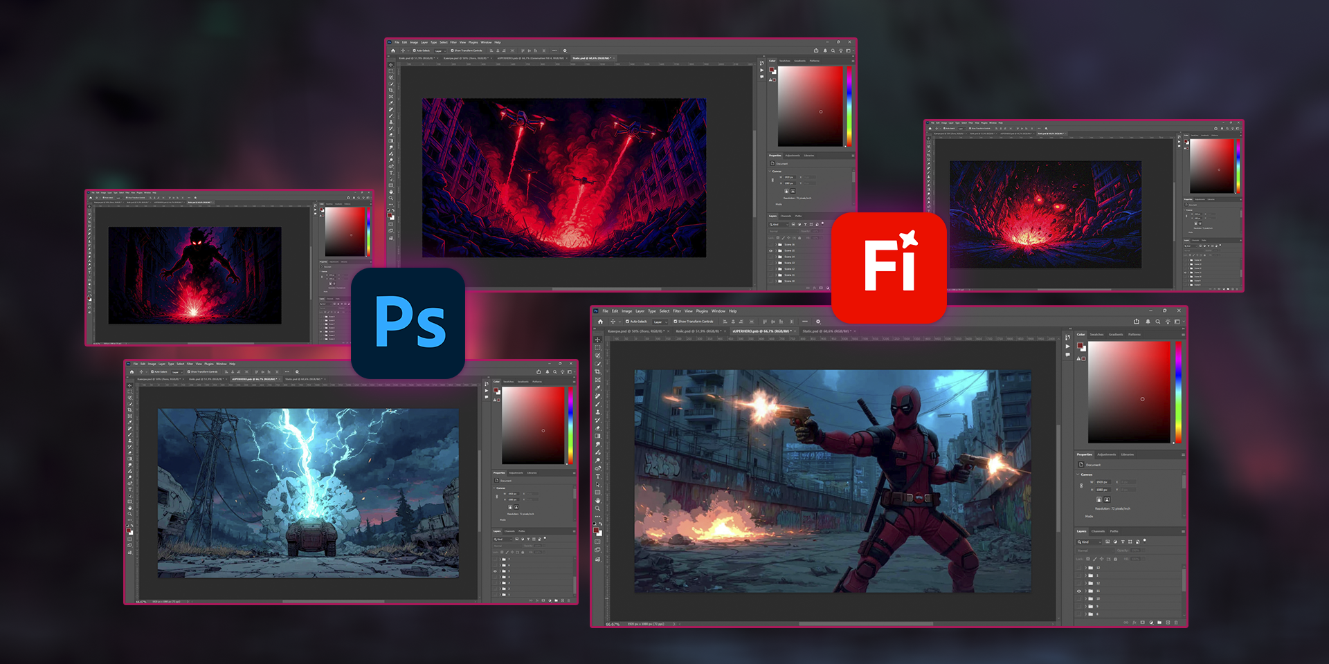 У After Effects відтворювалася динаміка руху: дрон, створений у Midjourney, проходив роторскопію та окрему анімацію, а ефекти блискавок і текстові елементи додавали фінальну енергію кадру.