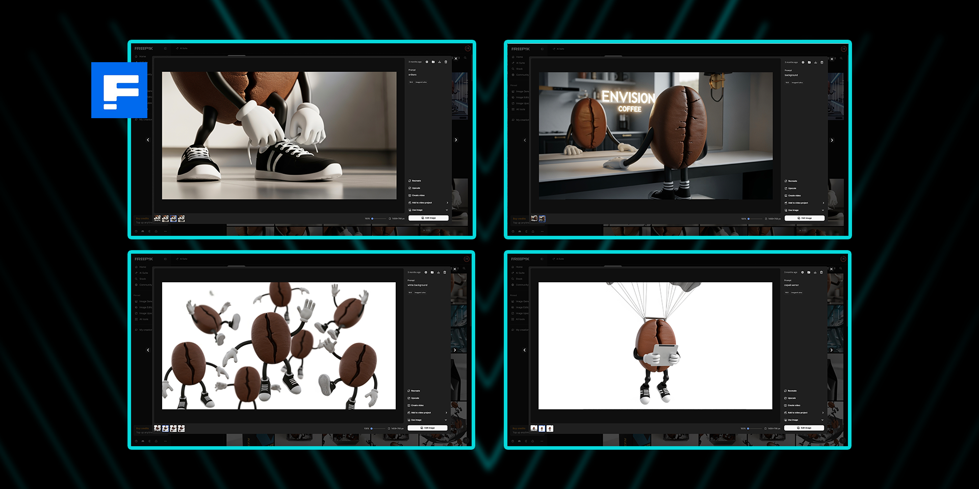 Персонажі створювалися на базі Runway Reference із точним контролем освітлення та міміки, а дрібні елементи — на кшталт рук, чашок чи кавових зерен — доопрацьовувалися у 3D-масках і бібліотеках Freepik.