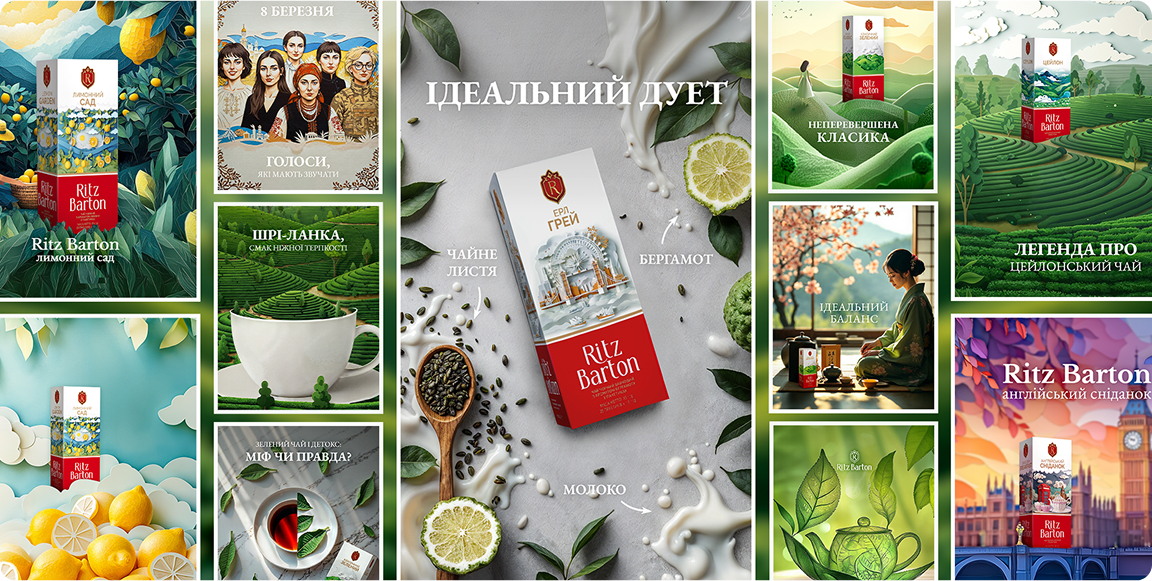 Ми розпочали роботу з Ritz Barton ще до його виходу на ринок — бренд не мав соцмереж, лише ідею: відродити мистецтво неспішного чаювання у дусі аристократичних традицій. За чашкою чаю бренд пропонував не просто напій, а момент розкоші, гармонії та уваги до себе.