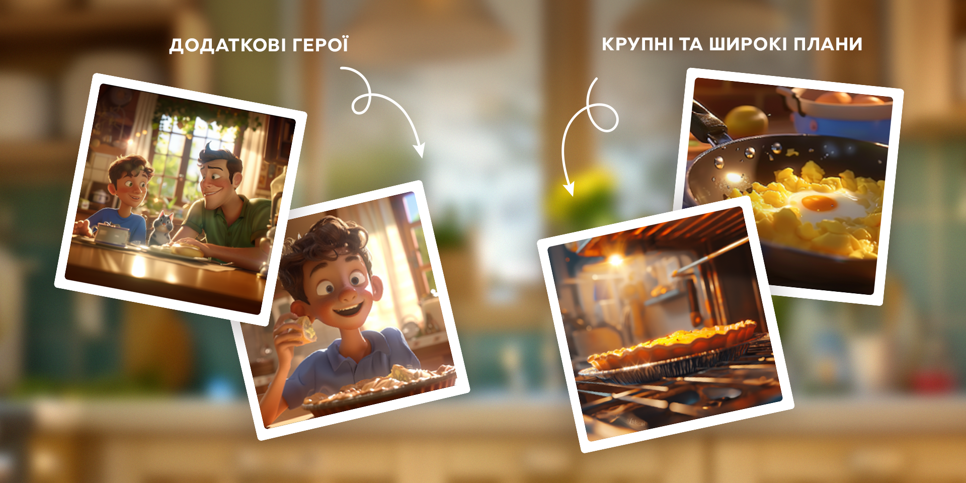 Щоб ролик був динамічним і залучав аудиторію протягом 30 секунд, ми урізноманітнили режисуру: додали родину головної героїні — сина, батька та кота, які підкреслювали атмосферу затишку. Завдяки різним планам і понад 10 сцен із героями та елементами приготування їжі, монтаж став живим і цікавим. Візуальні елементи ожили завдяки анімаційним інструментам Runway, Pixverse, Haiper AI та Stable Video, а природність фінальних сцен доповнила точна синхронізація губ героїні зі звуковою доріжкою, яку ми досягли за допомогою функції Lip Sync у Runway.