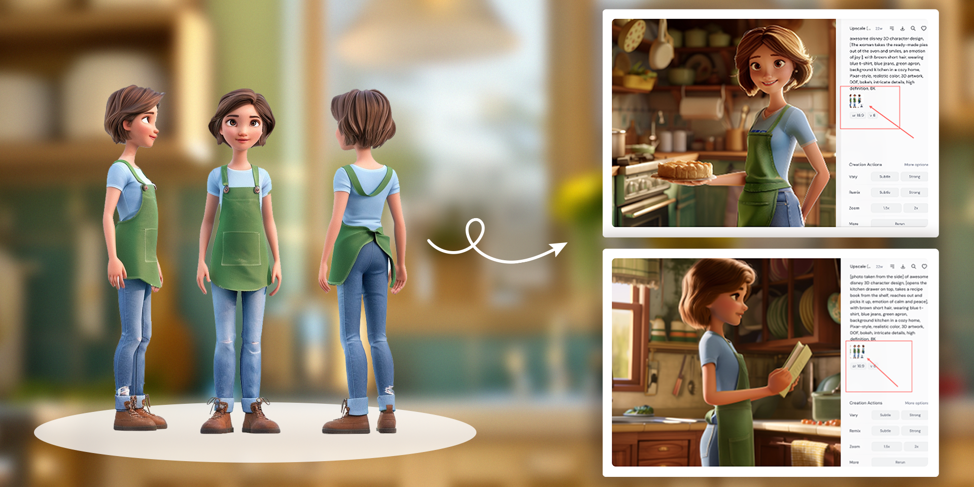 Кожна сцена відтворювала атмосферу домашнього затишку: кухню, деталі декору, теплі кольори, динаміку рухів. Завдяки функціоналу Midjourney ми перенесли персонажку зі студійного білого фону до побудованих інтер’єрів, синхронізуючи пози, емоції та ключові моменти зі звуковою доріжкою.
